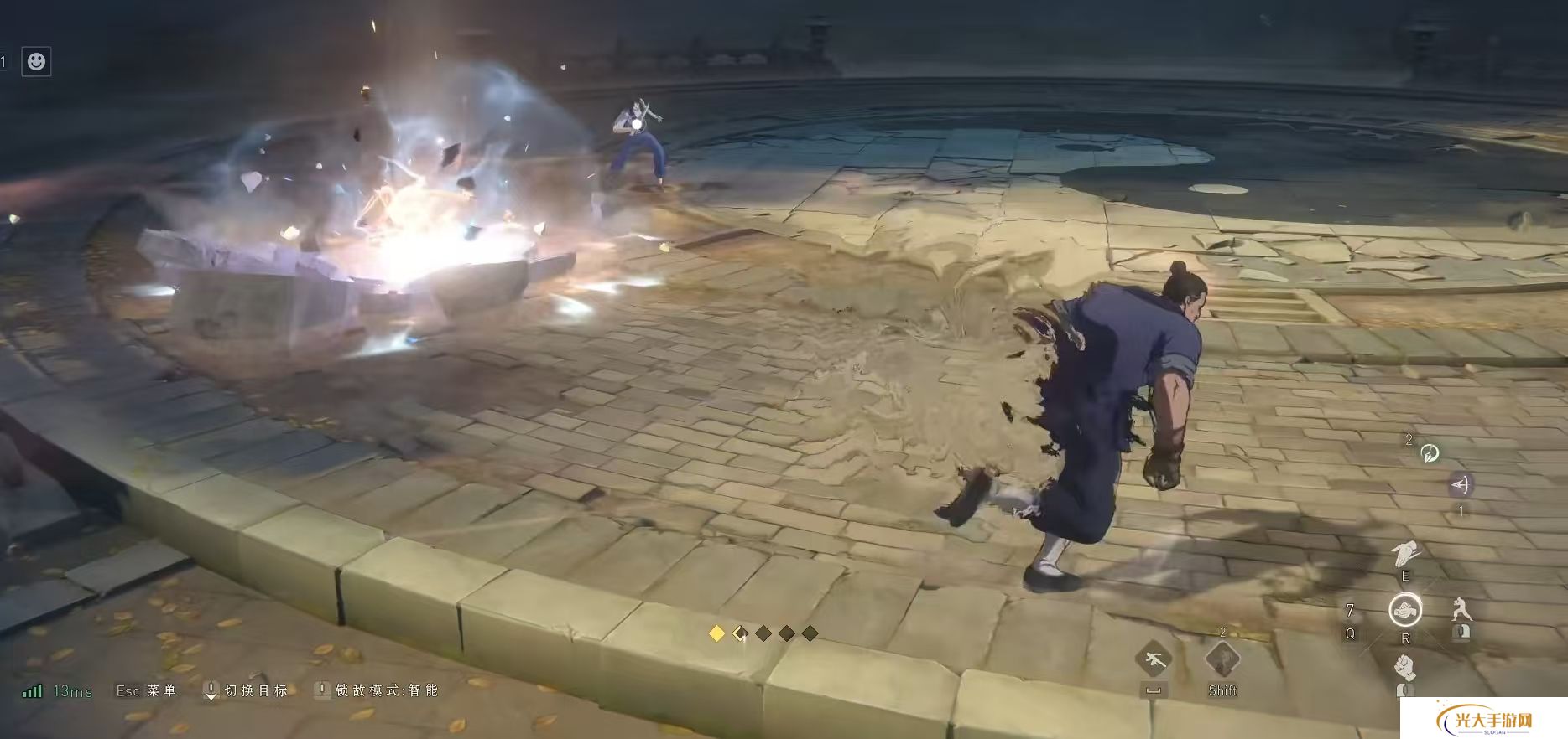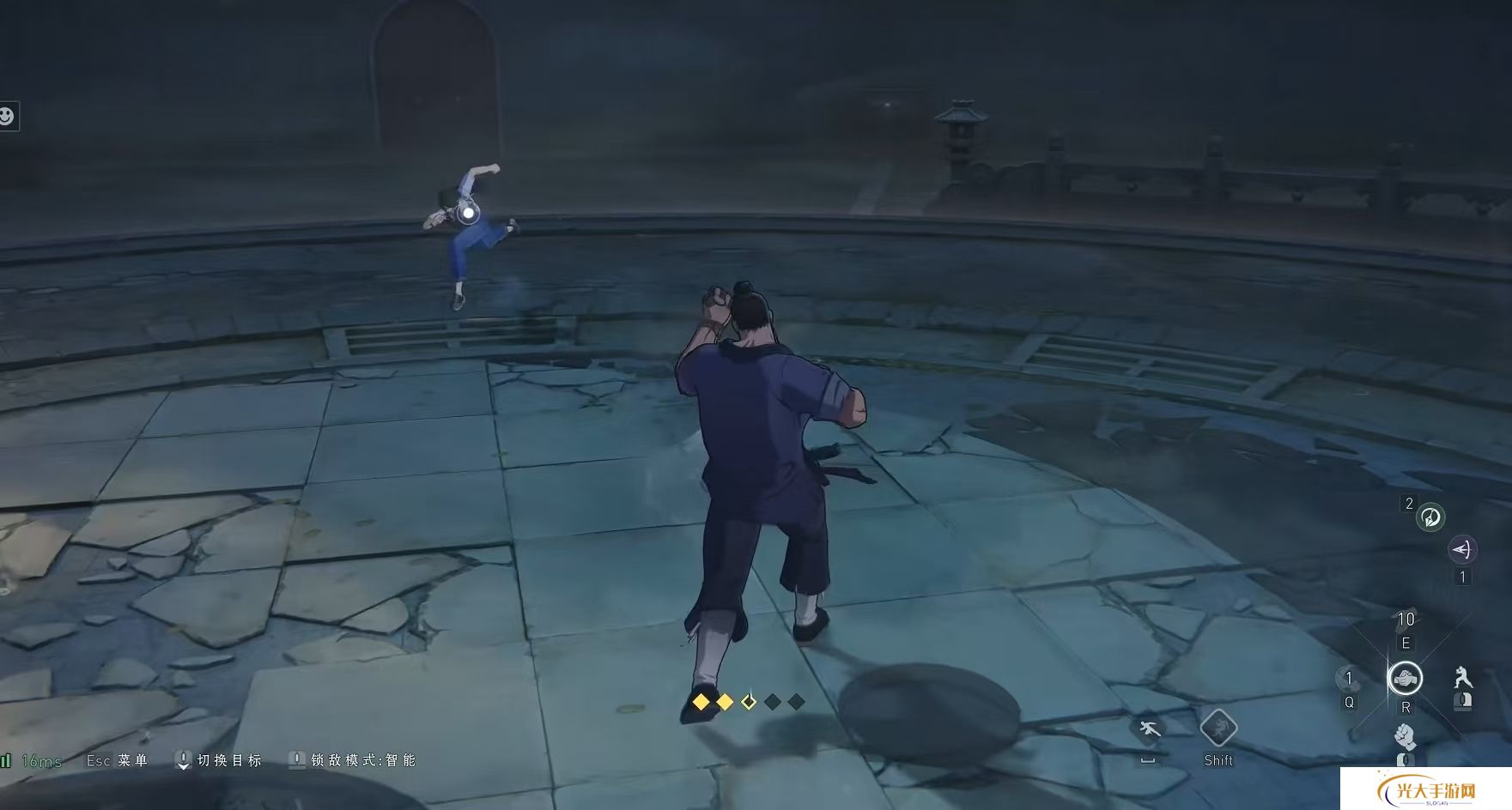 荣山在游戏中的强度是毋庸置疑的,但是这个角色的操作要求还是比较高的。在游戏中荣山总共有3个技能,普攻伤害是连招的伤害的关键。荣山的普攻分为三个阶段,1a是2a是左右拳,3a推掌4a击飞。一技能翻江倒海是将金光附着在双拳上,打出重拳的伤害。