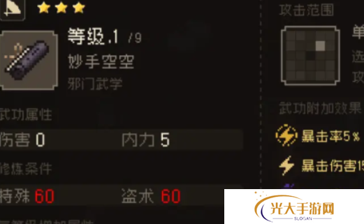 这样再把这个情况告知给鬼手之后,他就会传授给玩家妙手空空这个武学,通过这个武学在游戏里**武功秘籍,获得大量的游戏资源,想要掌握妙手空空,首先玩家的偷盗等级需要比较高,另外角色还需要尽力提升自己的悟性,只有这样才能灵活使用妙手空空,只不过使用这个武学是有一定弊端的,玩家需要时刻让自己的道德值保持在五以下,等到可以灵活掌握之后,再通过选择增加道德值的选项,恢复自己的道德值。