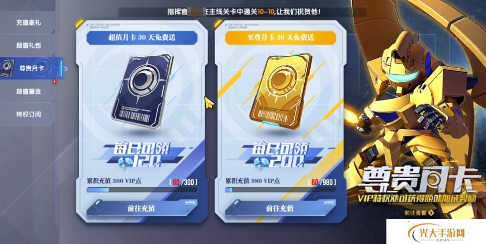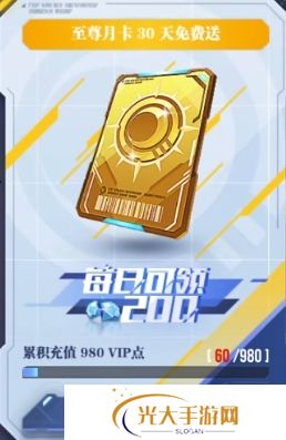而至尊月卡相较于超值月卡,更是展现出了其独特的吸引力,它每日最多可供玩家领取200钻石,这无疑为玩家提供了更为丰厚的资源回报,然而要想获得至尊月卡,就需要玩家在游戏中展现出更强的消费实力,累计充值需达到980的VIP点数。