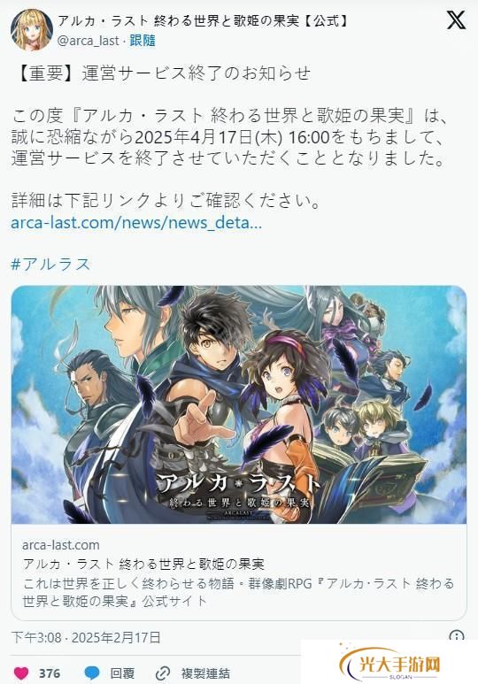 Appirits 于2月17日宣布,旗下智慧型手机游戏《ARCA・LAST 终焉世界与歌姬的果实(暂译,日文原名:アルカ・ラスト 终わる世界と歌姫の果実)》确定于 2025 年 4 月 17 日结束服务。