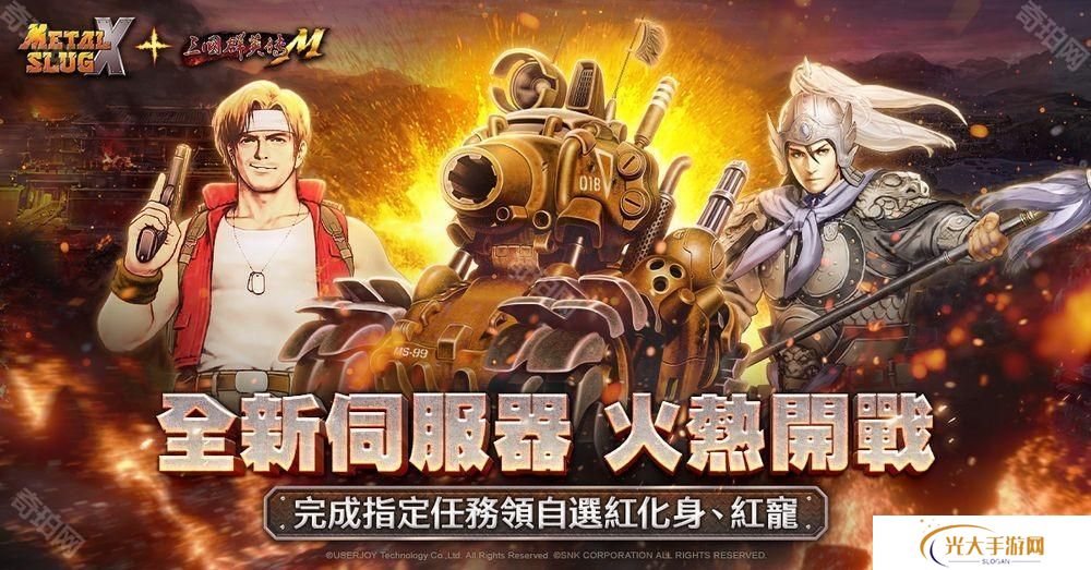 《三国群英传 M》首次与《合金弹头 X》携手合作,为玩家带来一系列精彩的联动内容,传奇角色「一文字百太郎」化身副将前来助阵,经典载具「SV-001 Metal Slug」也将陪伴玩家在三国世界中驰骋,还有「SV-Camel」骆驼座骑等你驾驭,展现独特风采。挑战联动副本「合金风暴」,击败副本 BOSS「R-Shobu」,就能获得稀有道具。透过收集活动补给箱,还能兑换联动副将、宠物等限量道具,完成指定挑战任务,再送空前奖励,自选红化身、红宠让你挑选。