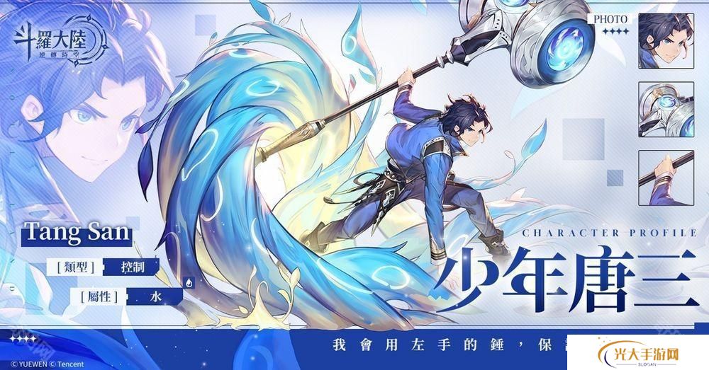 唐三,前世为唐门外门弟子,明志跳崖后穿越至斗罗大陆,在斗罗大陆上,他是一名水系控制系魂师,作为场上重要的控角,控制系魂师的特色为释放异常状态来限制对手的行动,达到调配战场节奏之效果。少年唐三的武魂为蓝银草,战场上触发武魂真身状态下,会于敌方战败时释放【蓝银束缚】,对敌方一排造成高达 60% 的攻击伤害。被动技能【乱披风锤法】在敌人战败时,还能带来最终伤害永久提高 10% 的效果。