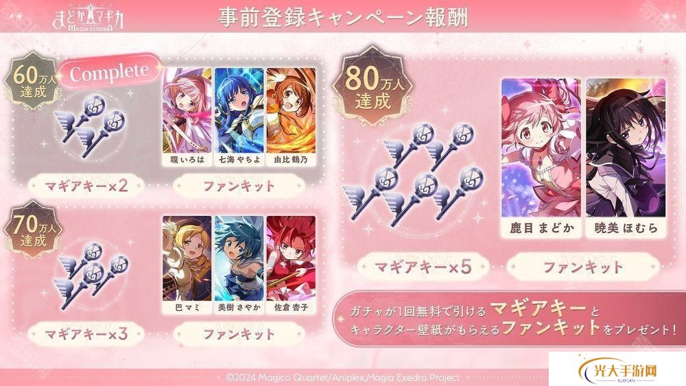 官方表示,《魔法少女小圆 Magia Exedra》的事前预约数已达到 60 万。根据事前预约数,玩家将可获得游戏中可用于抽转蛋的魔法钥匙、以及角色的桌布。