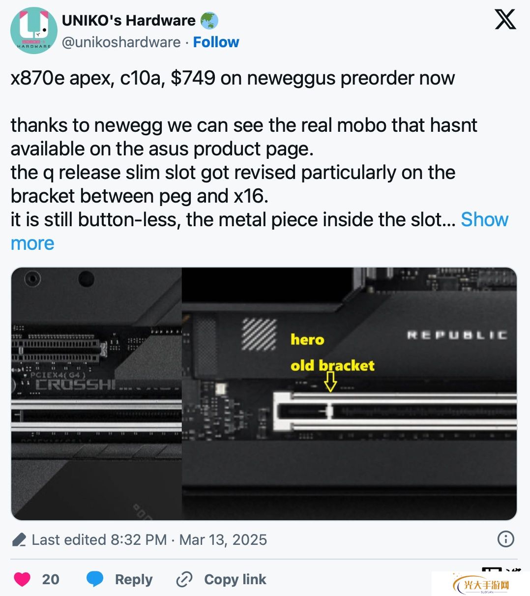消息源 Uniko"s Hardware 在X平台透露,华硕在相应主板中悄悄改进了其“Q-ReleaseSlim”快拆功能,从而降低显卡“金手指”在拆装时受到损伤的概率。