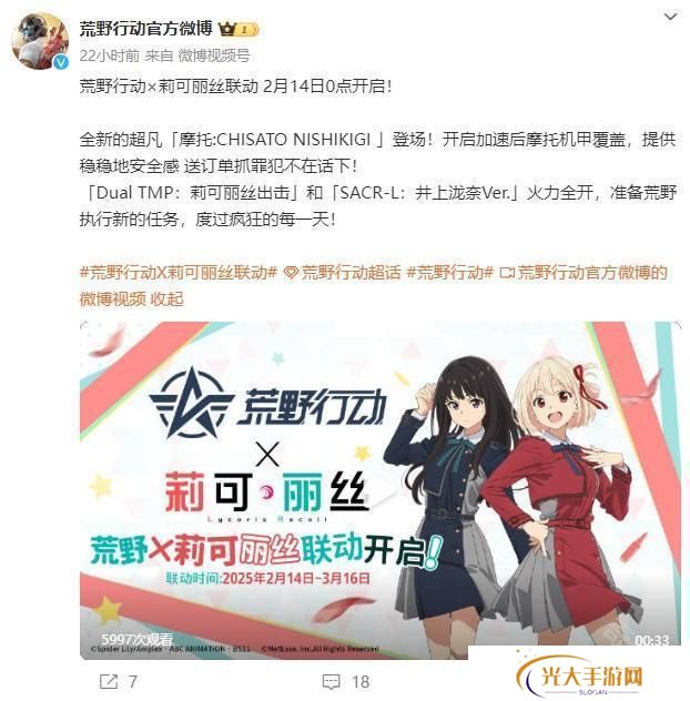 网易游戏(NetEase Games)宣布,大逃杀游戏《荒野行动》(iOS / Android / PC / PS4 / Nintendo Switch)预告 2 月 14 日0点起与《Lycoris Recoil 莉可丽丝(リコリス・リコイル)》开启合作活动,活动将持续至 3 月 16 日为止。