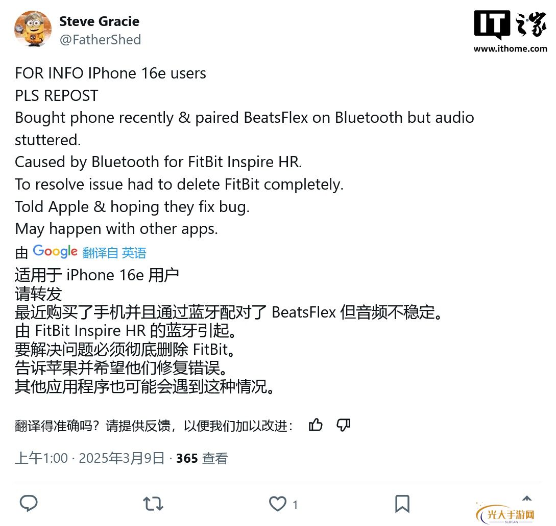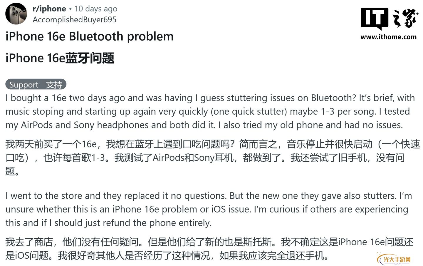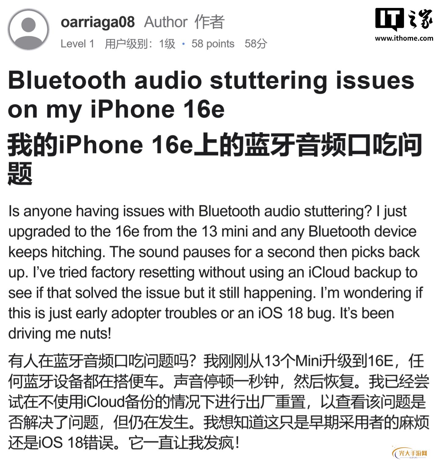 用户在 Apple 支持社区、Reddit 和 X 平台抱怨称,iPhone 16e 连接蓝牙音箱后,音频在播放过程中出现卡顿或中断,影响用户体验。本站附上相关截图如下:
