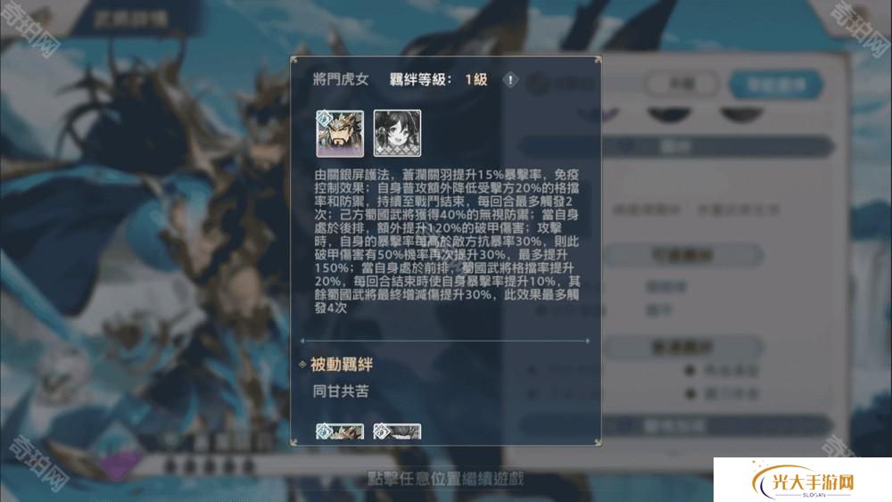 「苍澜关羽」可分别与「关银屏」与「关平」组成羁绊效果。与「关银屏」组成羁绊时,可以使蜀国队伍的进攻防御属性都得到提高。在「关平」羁绊下,则无需任何助力就能为己方武将锁血,为团队提供了超强的生存保障。苍澜关羽的这两个羁绊都非常适配蜀国队伍,和蜀国武将一起出战必能达到事半功倍的效果,带领蜀国队伍再攀登巅峰!