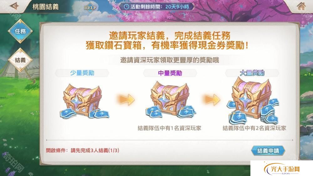 邀请 3 名好友共玩游戏,完成「桃园结义」任务,即可获取钻石宝箱!邀请的玩家更资深,则奖励更丰富!宝箱中除了能领取大量幻星和觉醒石等养成资源外,甚至还有机会拿到现金券奖励哦!