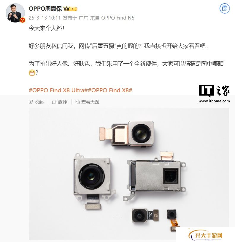 本站 3 月 13 日消息,OPPO Find 系列产品负责人周意保今日公布了 Find X8 Ultra 手机的镜头组件,并表示为了拍出好人像、好肤色,新机采用了一个全新硬件。