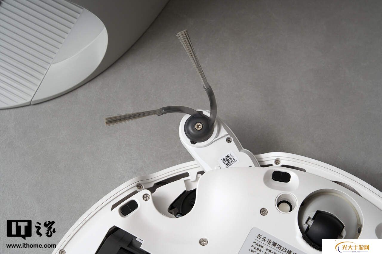最大的变化在于这枚圆形的升降激光传感器,上面印有石头 Logo,并配有银色装饰,尽显金属质感。与之前的 P 系列不同,这枚 LDS 激光雷达在非工作状态下会降下,工作时则根据环境情况自动升降。