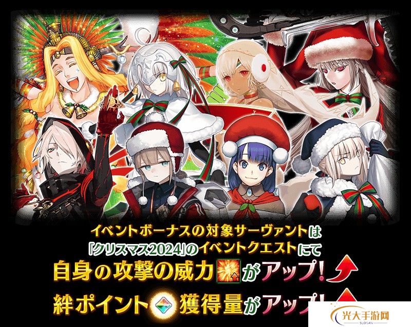 面对即将自 12 月 11日举办期间限定活动「圣诞节 2024」,率先在期间内 12 月 4 日~12 月 18 日实施举办前预热活动,内容包含了特别登入次数登入奖励、期间限定任务、活动加成从者 犟化大成功・极大成功 2 倍&羁绊获得量提升 20%。
