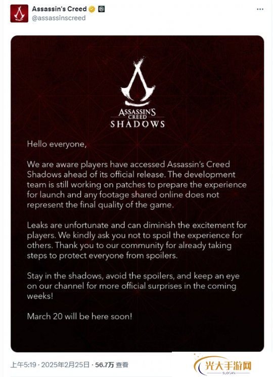 育碧官方在公告中称:“我们知道有些玩家已经在正式发布之前就玩到了《刺客信条:影》。开发团队目前仍在开发补丁,为正式发行做准备。目前任何流出的画面都不能代表游戏的最终质量。内容泄漏是不幸的,会减少玩家的兴奋感。我们恳请诸位不要破坏别人的体验。也感谢我们的社区已经采取措施,保护每个人免受剧透困扰。”