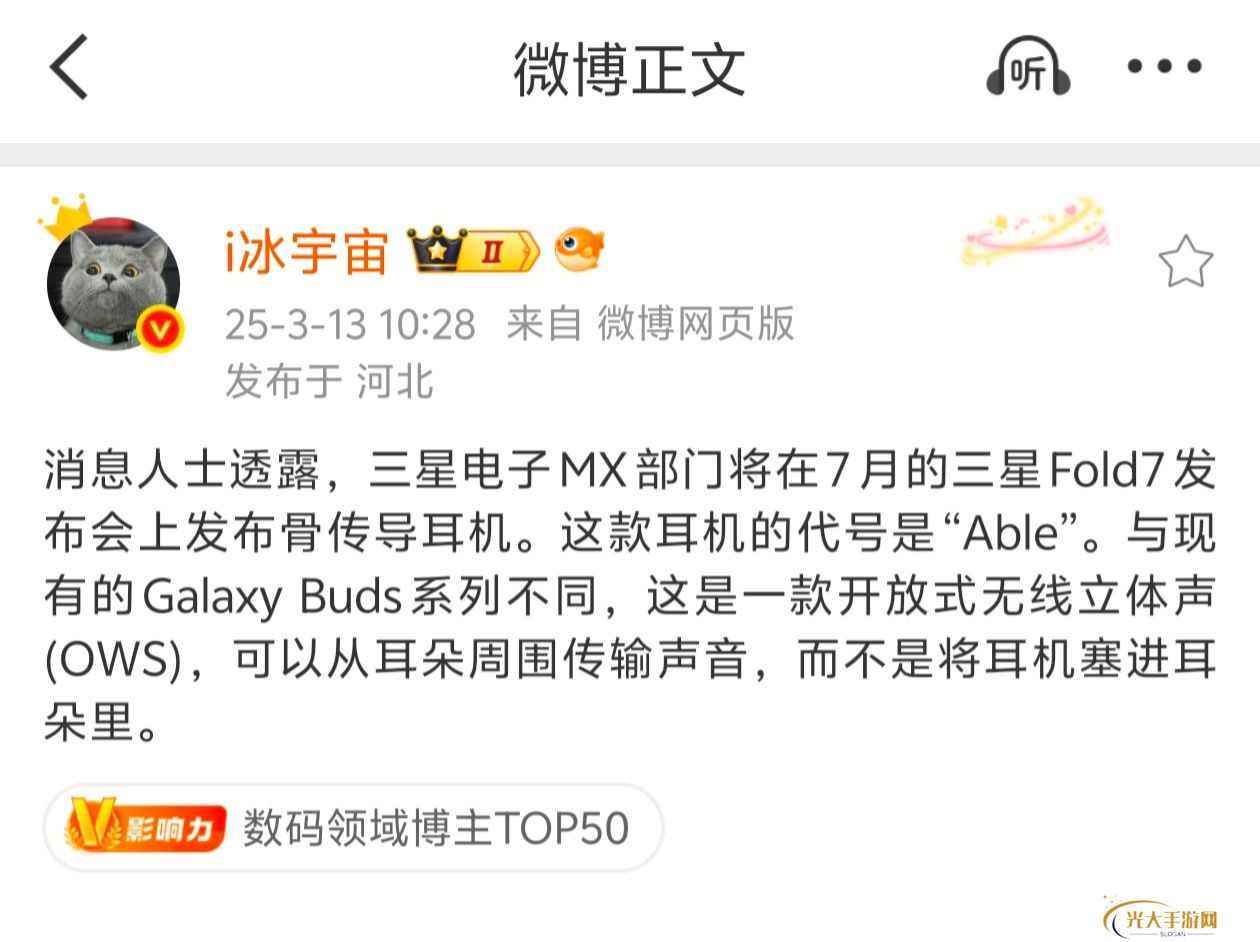 本站 3 月 13 日消息,@i冰宇宙 今天援引消息人士的话透露,三星电子 MX 部门准备在 7 月的三星 GalaxyFold 7 系列手机发布会上推出一款骨传导耳机。
