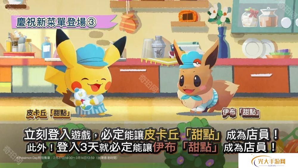 为庆祝新菜单登场,活动期间登入游戏必定能让【皮卡丘 「甜点」】成为店员,登入 3 天就必定能让【伊布「甜点」】成为店员。
