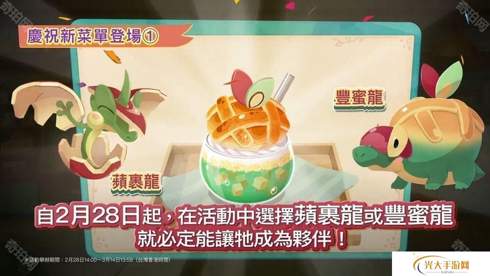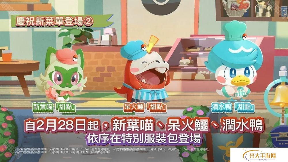 自 2 月 28 日(五)起,在活动中选择苹裹龙或丰蜜龙,就必定能让牠成为伙伴。特别换装的【新叶喵 「甜点」】、【呆火鳄 「甜点」】、【润水鸭 「甜点」】也将依序登场。
